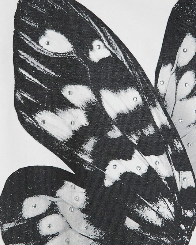 An oversized hoodie with a single butterfly motif offers both warmth and a modern, streetwear feel.
